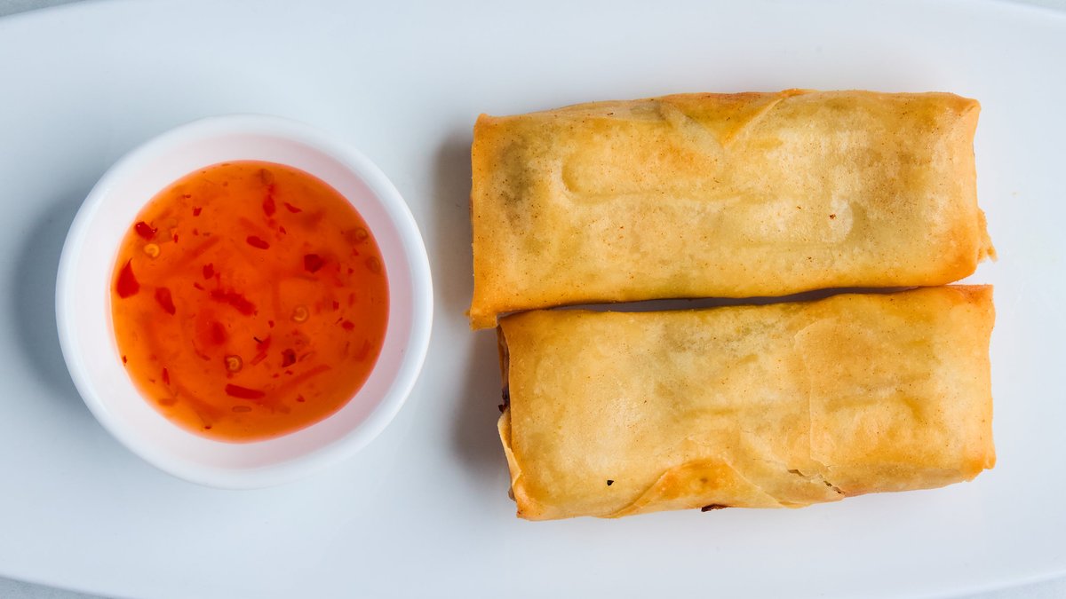 3 stykk innbakt scampi med ris og sweet chili saus.