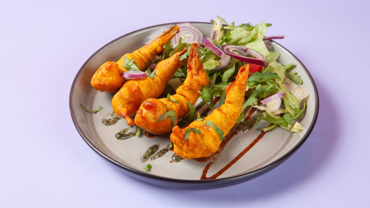 Scampi marinert i en spesiell marinade, krydder og røkt i en tandoor ovn.