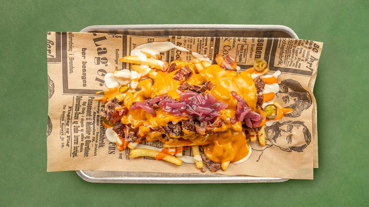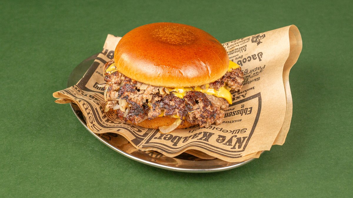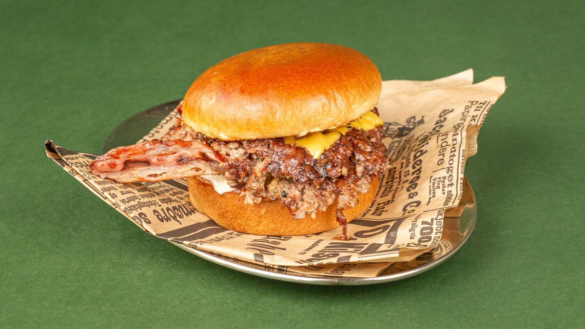 2 x digg smashkjøtt med cheddarostsaus, bacon, jalapeño, sriracha majones, aioli og syltet rødløk.