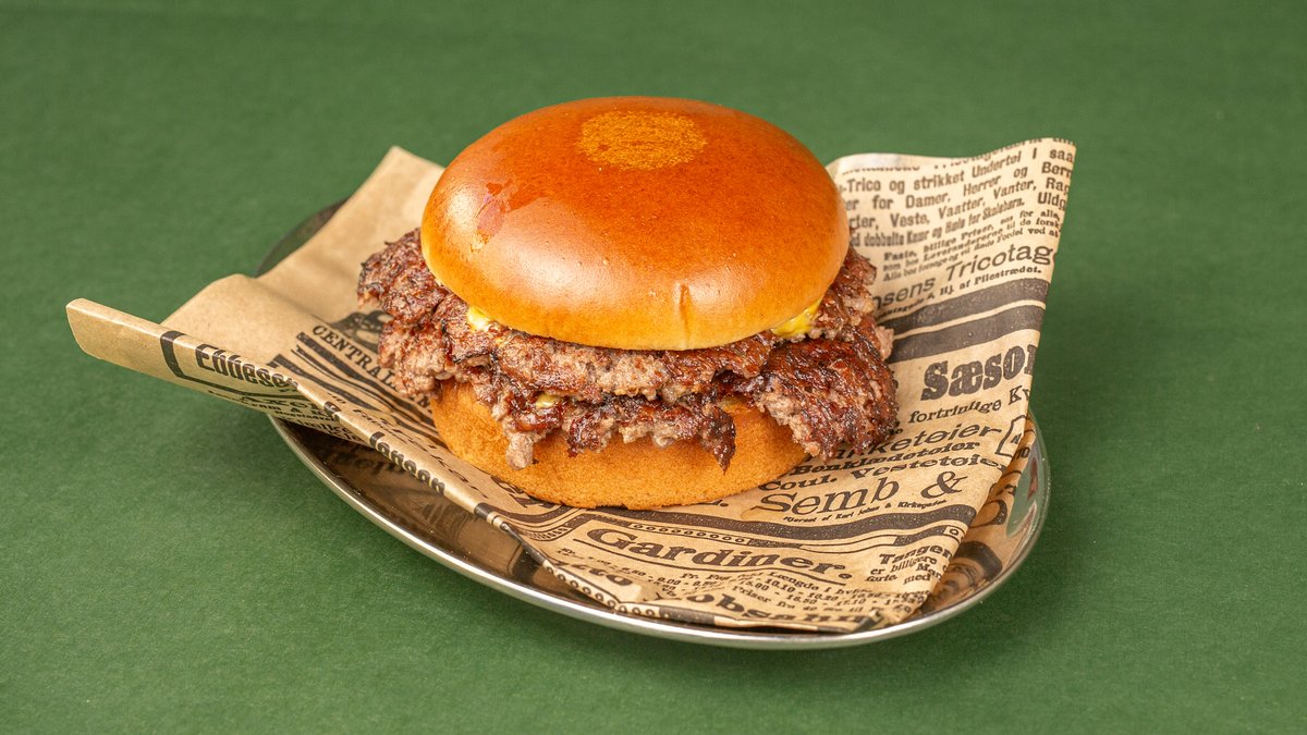 Burger med burgerost, Heinz ketchup, French's yellow mustard, sylteagurk og burgerdressing.
