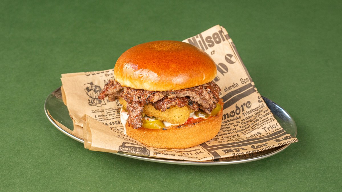 Burger med sjalottløk, burgerost, Heinz ketchup, French's yellow mustard, sylteagurk og burgerdressing. Serveres med Fries.