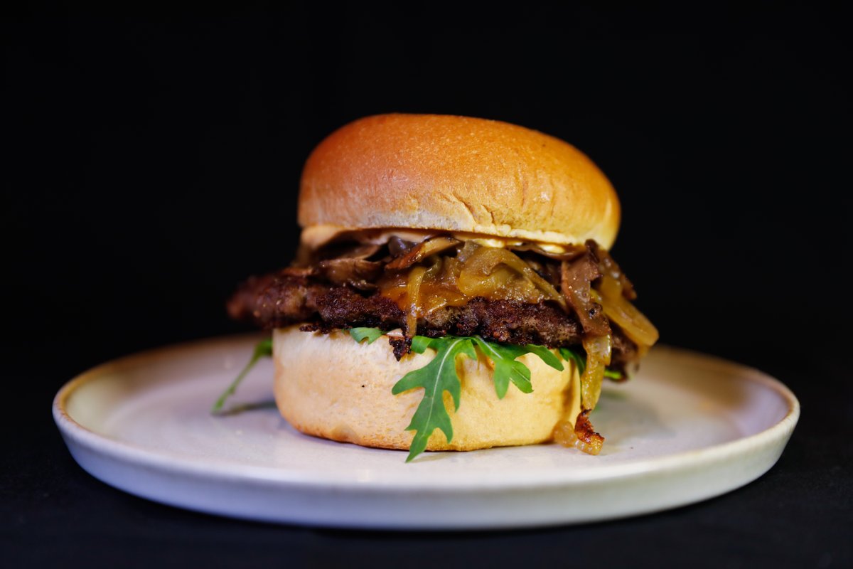 Serveres med buddy saus, ruccola, Engelsk cheddar, karamellisert løk og sopp.