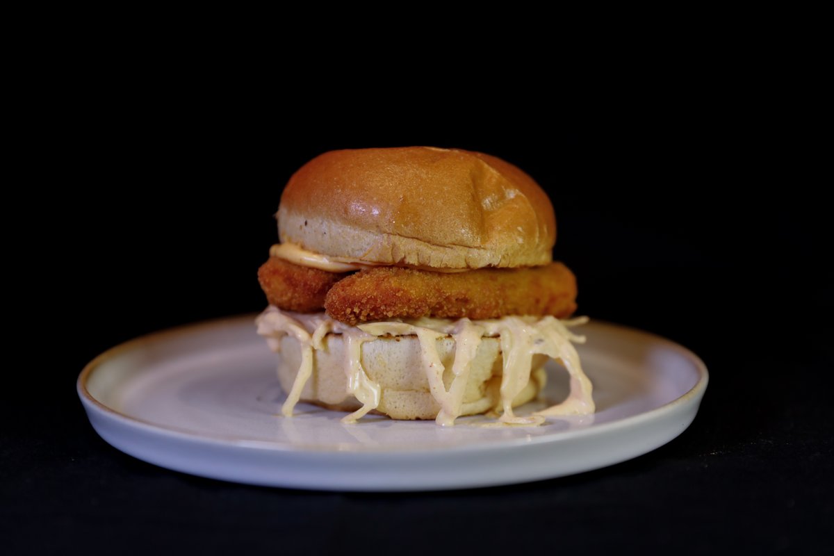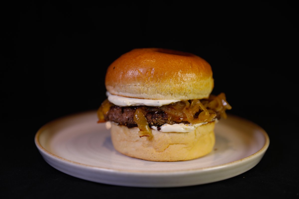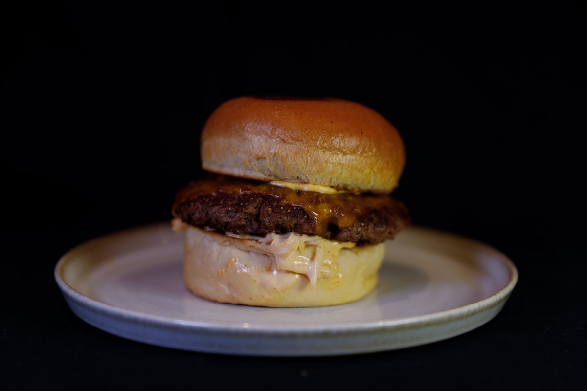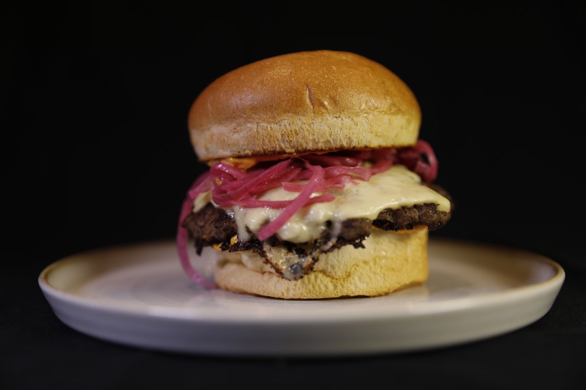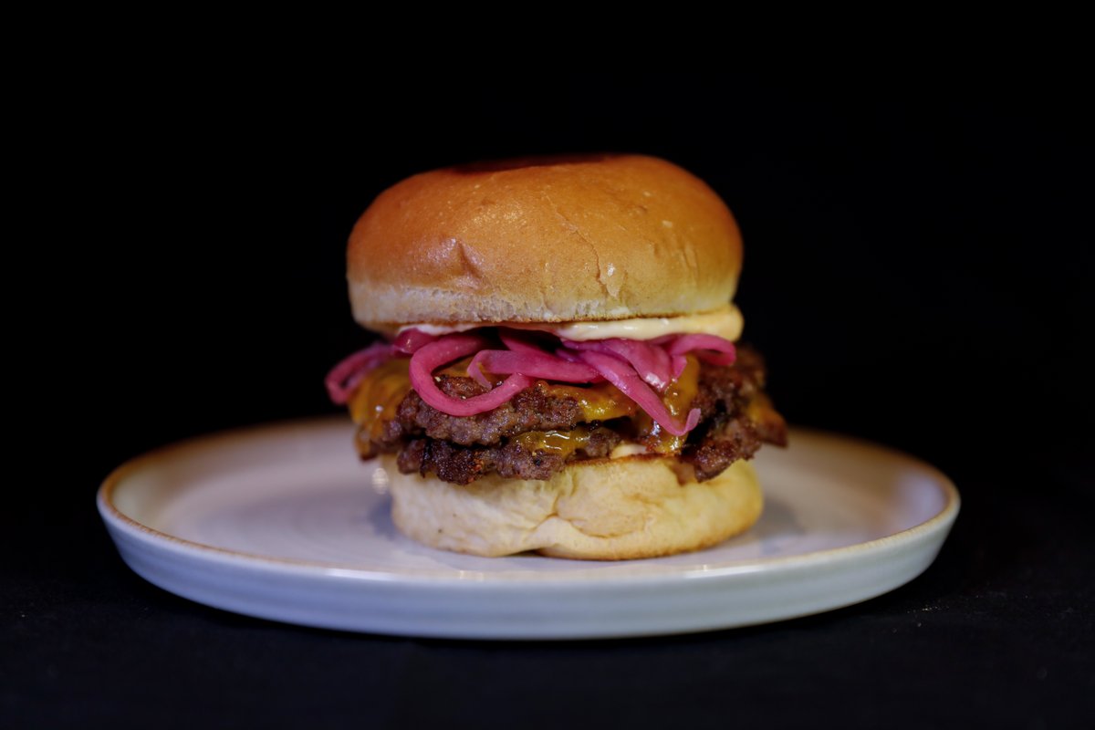 Serveres med spicy mayo, dobbel smash, dobbel Engelsk cheddar og syltet rødløk.