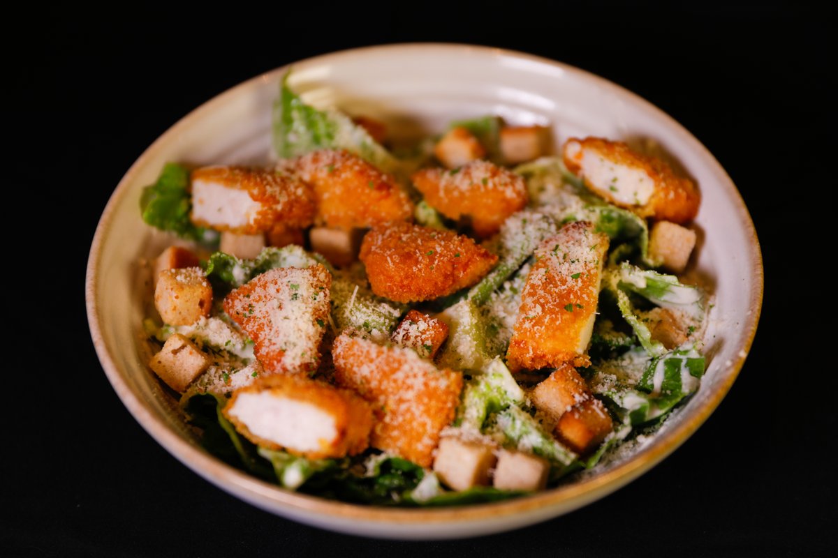 Serveres med romanosalat, panert kylling, krutonger, revet parmesan og caesardressing.