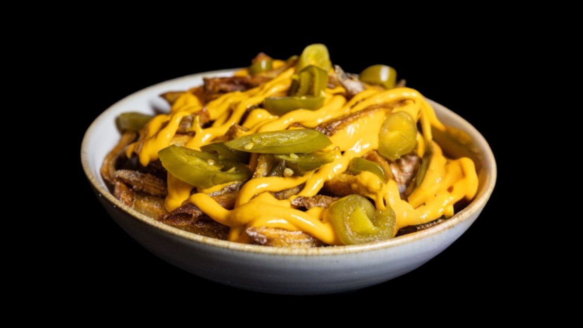 Fries med ostesaus og syltet jalapeño.