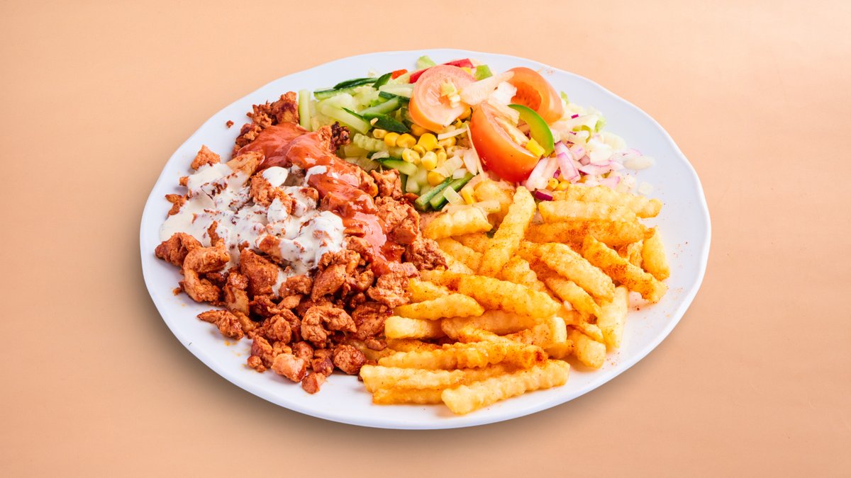 Kebabkjøtt, Kylling-, Biff, Salat, Pommes Frites, Kebabdressing, Pitabrød.
