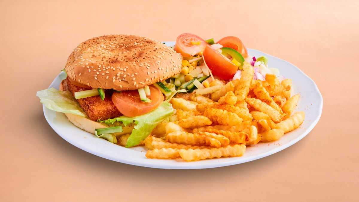 Kyllingburger, Dressing, Salat, Pommes Frites, 0,5L Drikke.