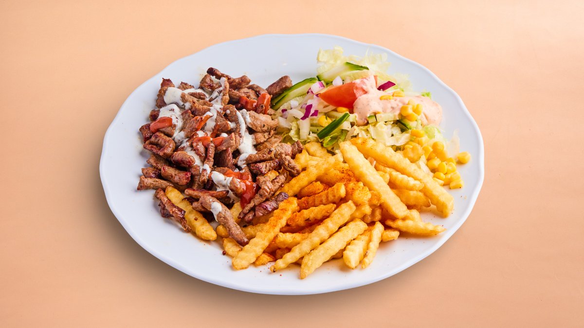 Kebabkjøtt, Salat, Pommes Frites, Pitabrød, Kebabdressing.