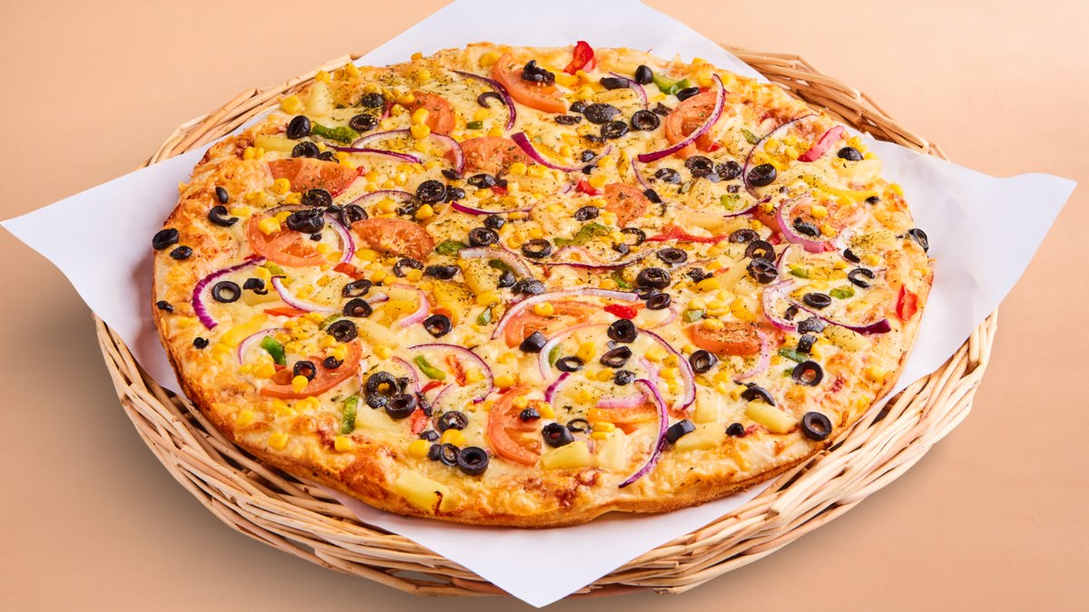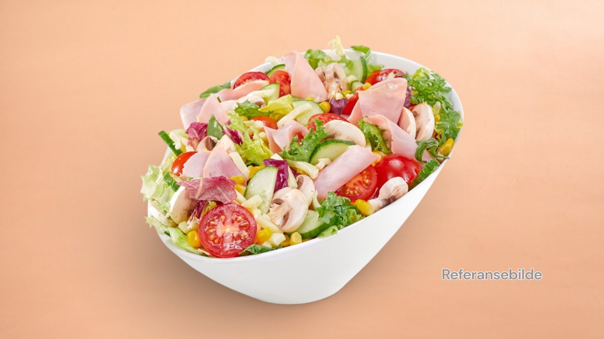 Ost, Tomatsaus, Paprika, Oliven, Tomater, Mais, Sjampinjong, Løk.