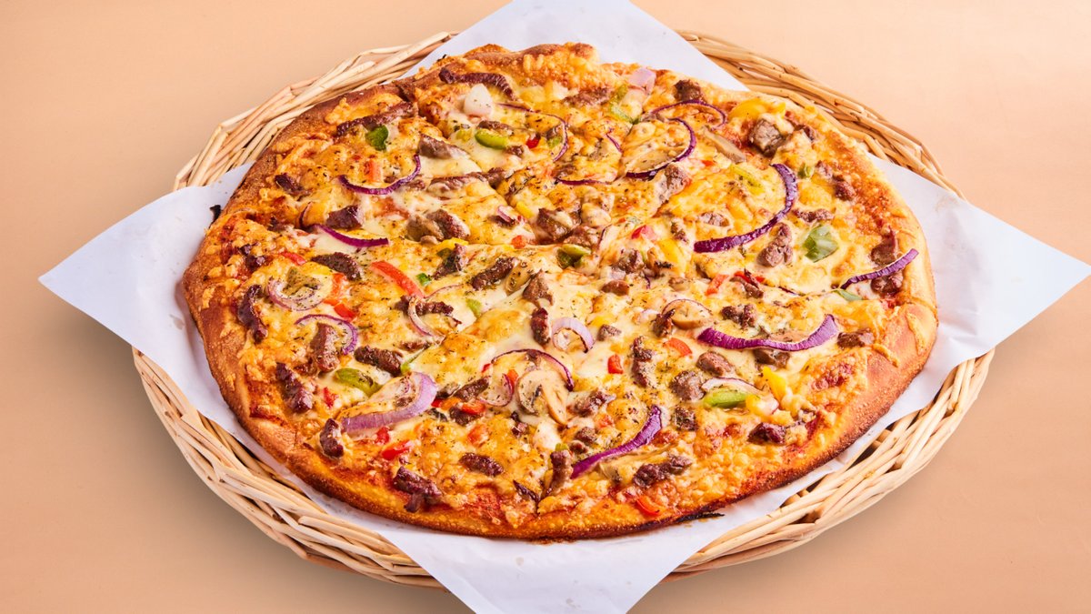 Ost, Tomatsaus, Marinert biff, Paprika, Løk, Sjampinjong.
