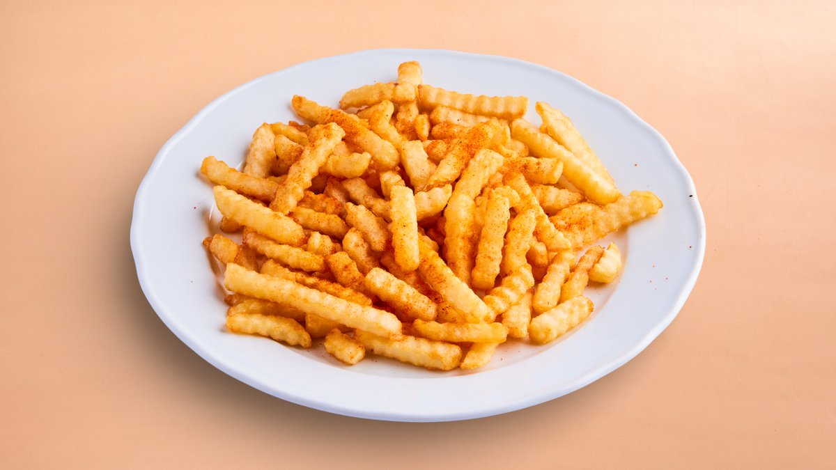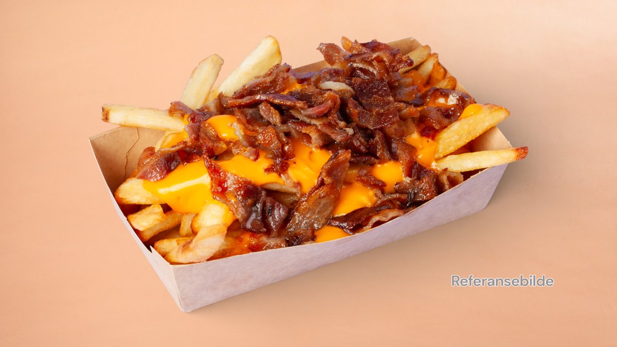Pommes strips toppet med chilli mayo, bacon og parmesan.