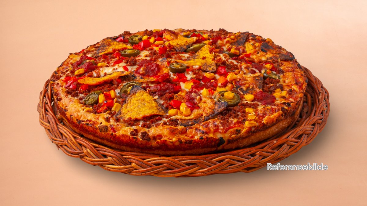 Ost, Tomatsaus, Kjøttdeig, Nachochips, Løk, Paprika, Jalapenos.