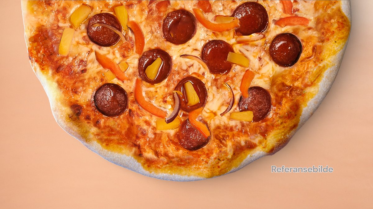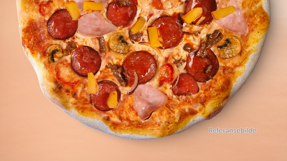 Ost, Tomatsaus, Pepperoni, Skinke, Biff, Løk, Sjampinjong, Ananas.