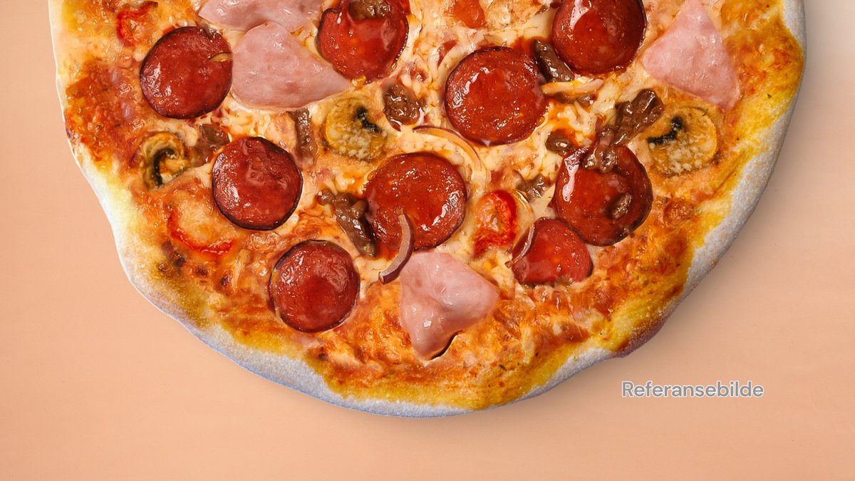 Ost, Tomatsaus, Pepperoni, Skinke, Biff, Bacon, Paprika, Løk, Sjampinjong.