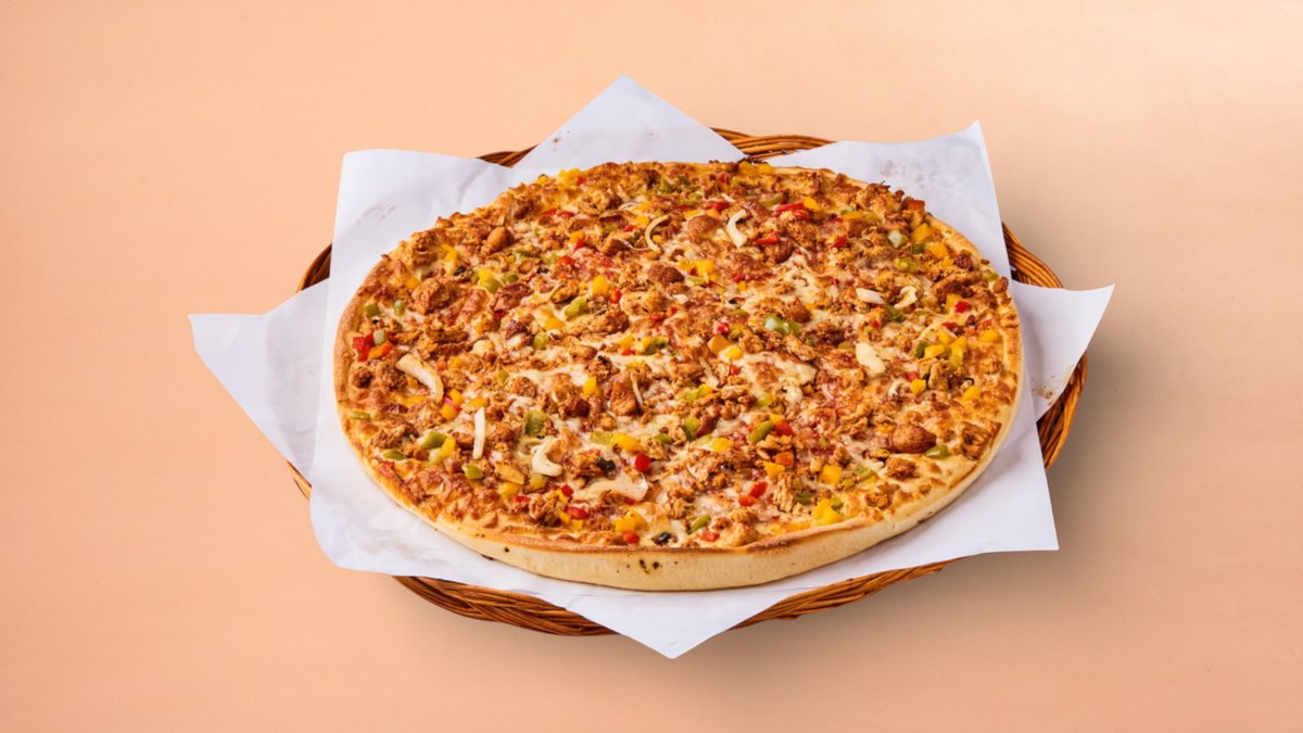 Ost, Tomatsaus, Marinert kylling, Paprika, Løk, Sjampinjong.