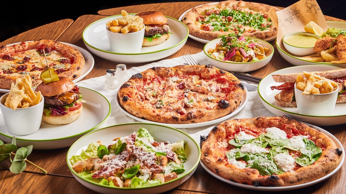 Burger med bacon, cheddar, plommetomat, crispysalat, syltet rødløk, syltet agurk og chipotlemajones.