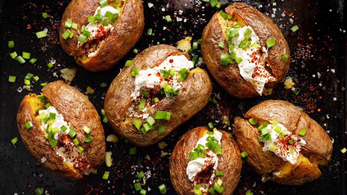 Bakt potet med krydder smør, ost, mais, dressing, bacon, kylling, skinke og kebab.