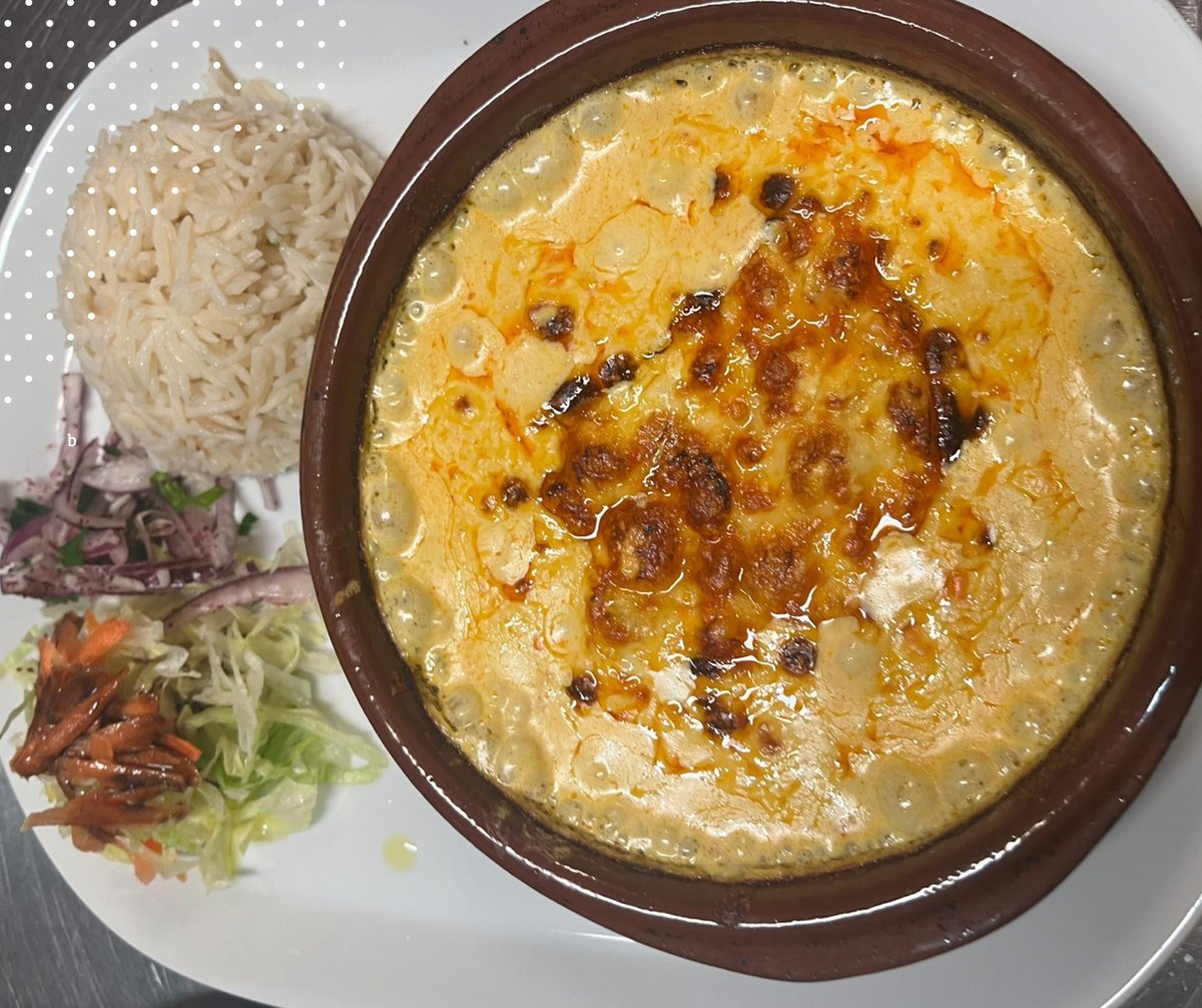 Kjøttdeig av storfe med krydret og spesiell saus med poteter, paprika og tomater bakt i en leirgryte. Serveres med tzatziki, brød og ris eller bulgur.