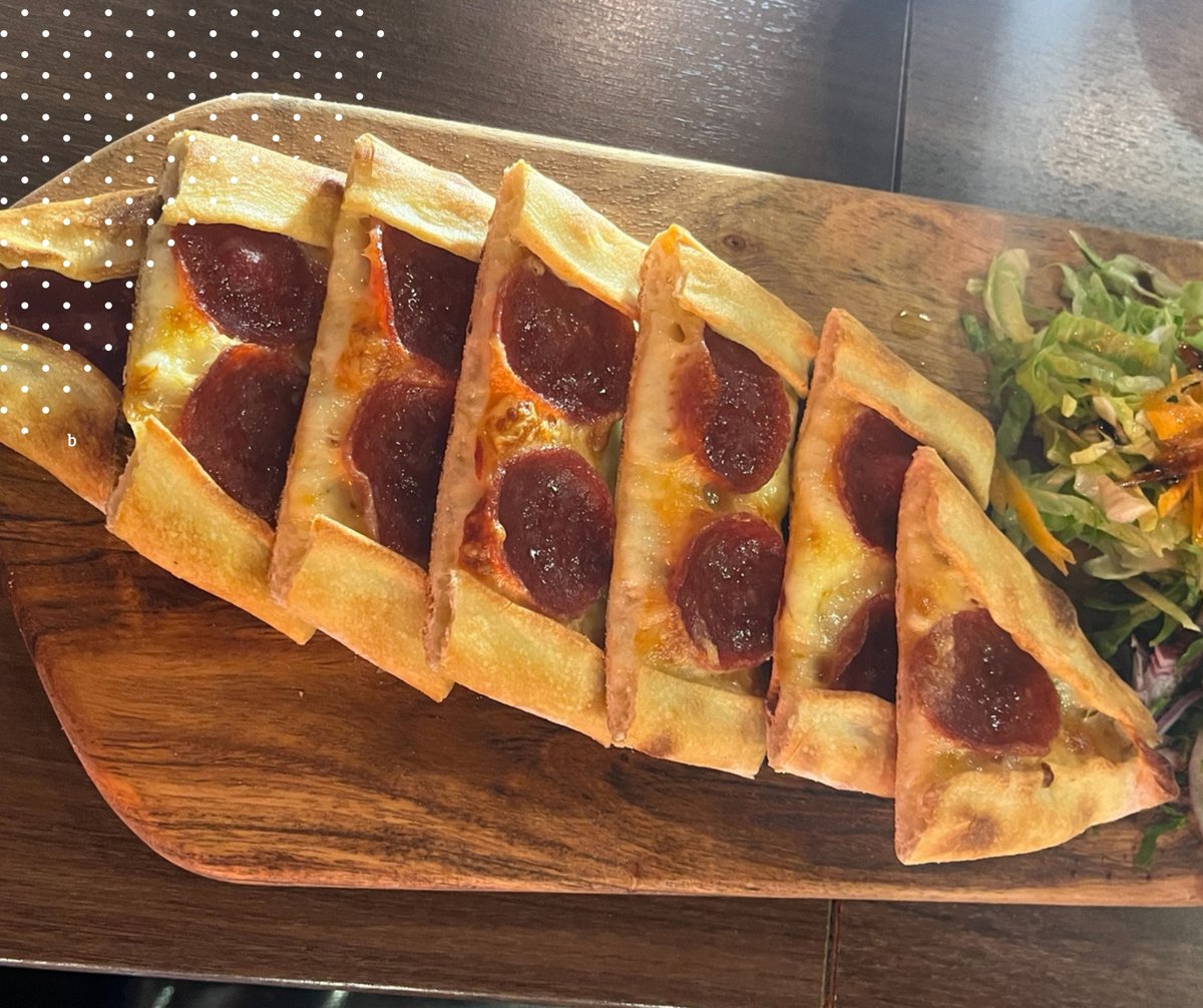 Tomatsaus, tyrkisk pepperoni, ost, løk, olivenolje, ruccola.