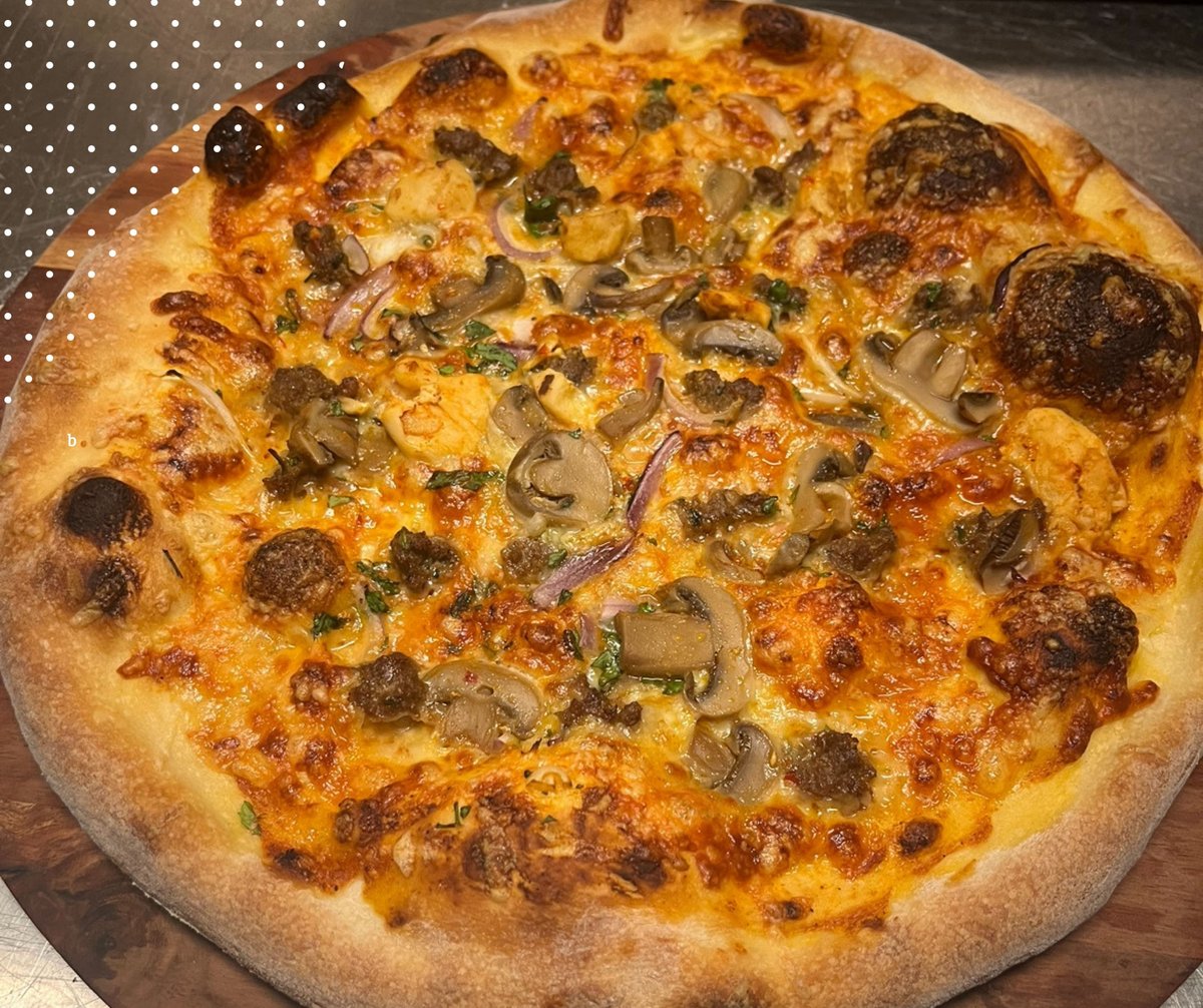 Tomatsaus, marinert kylling, sopp, ost, paprika, olivenolje og ruccola.