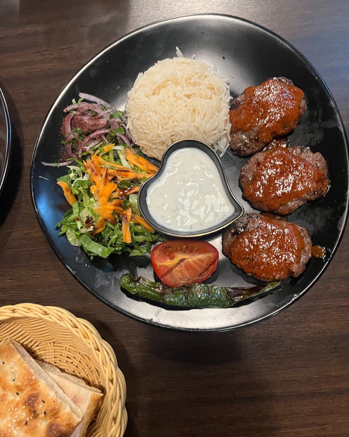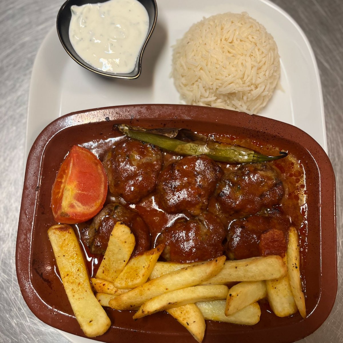 3 stk marinert kjøttkaker av storfe. Toppes med hjemmelaget tomatsaus. Serveres med salat, tzatziki, brød og ris eller bulgur.