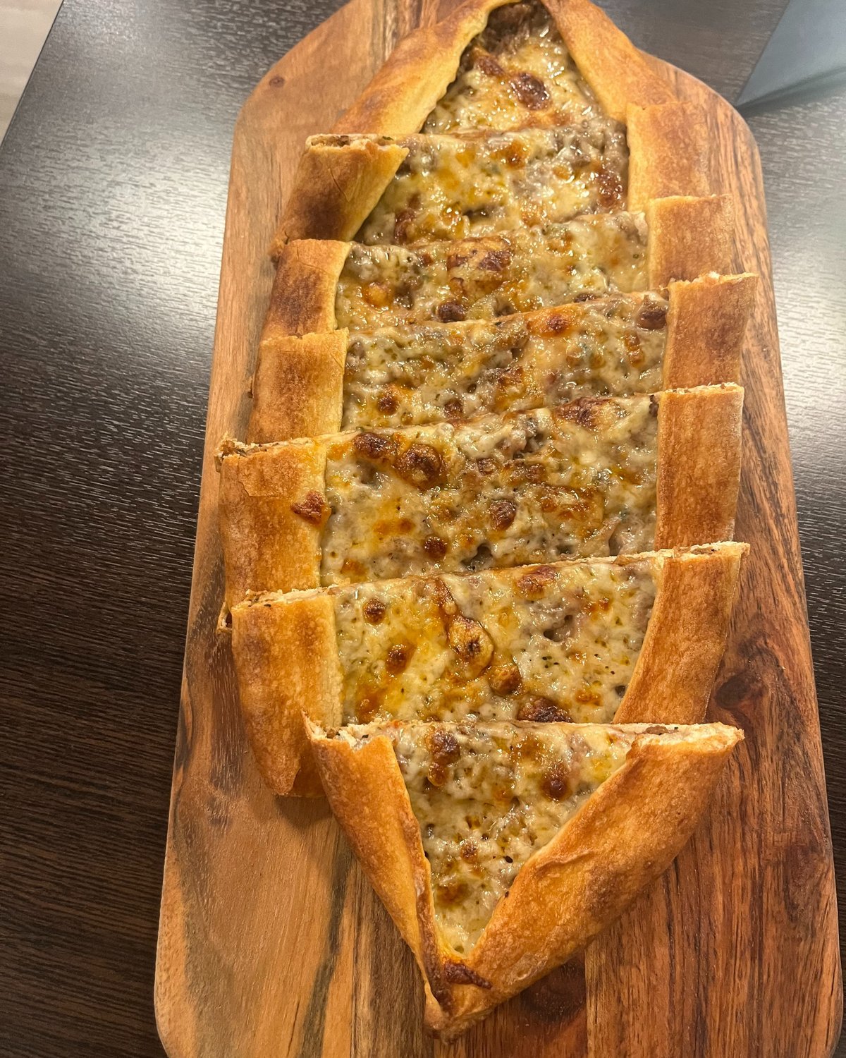 Hjemmelaget ovnsbakt kadaif noodles med sirup, tilberedt med mozzarella. Serveres varm og toppes med pistasjnøtter.