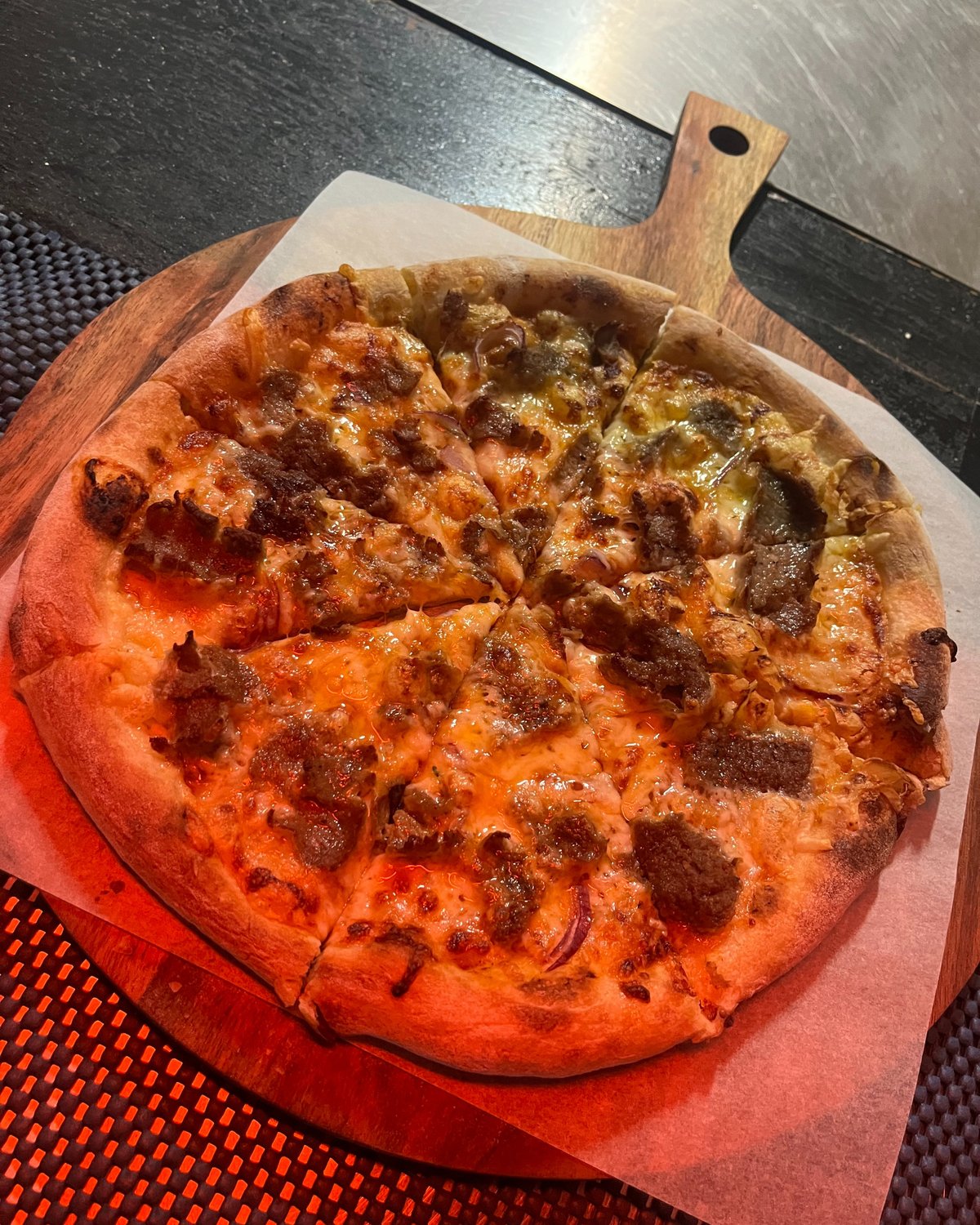 Tomatsaus, hjemmelaget kjøttdøner, oregano, paprika, ost, løk, olivenolje og ruccola.