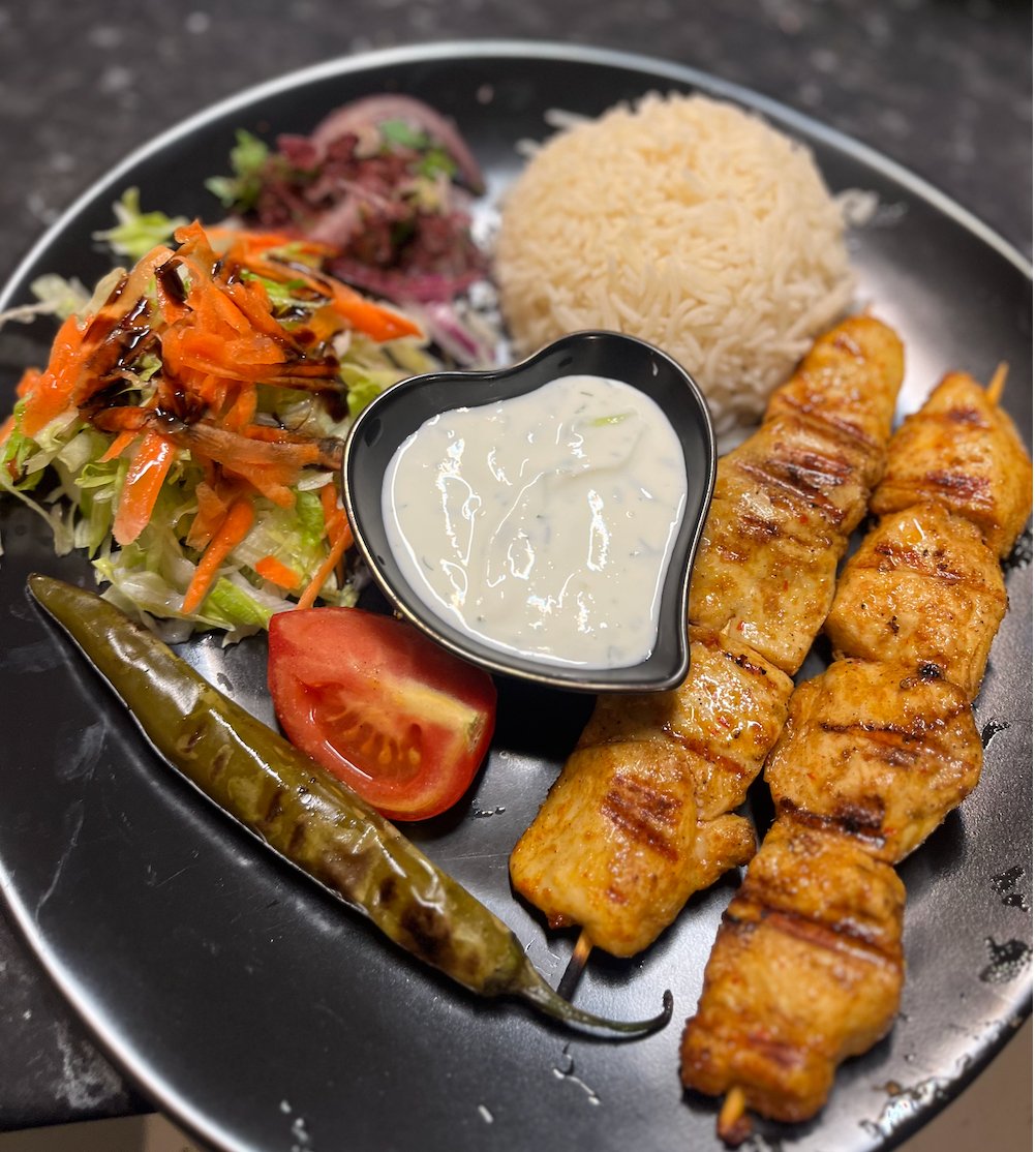 2 stk grillet marinert kyllingfilet på spyd og grillede grønnsaker. Serveres med salat, tzatziki, brød og ris eller bulgur.