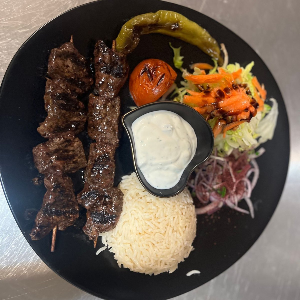 2 stk grillet marinert ytrefilet / indrefilet av storfe på spyd og grillede grønnsaker. Serveres med salat, tzatziki, brød og ris eller bulgur.