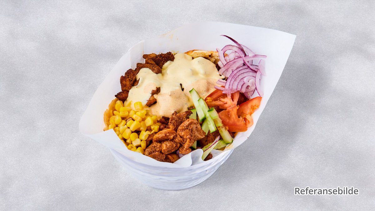 Kylling døner(kebab) med tomatsaus. Serveres med salat og pommes frites.