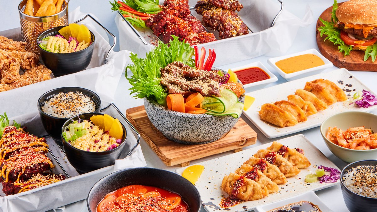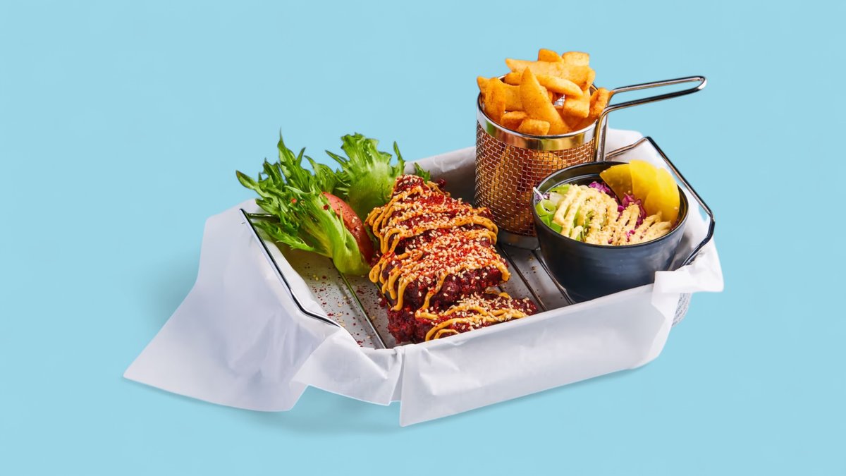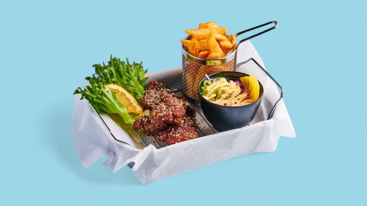 Hjemmelaget yangnyeom glaze som er søt, tangy og spicy med smeltet cheddar. Serveres med syltet reddik og asiatisk coleslaw. Velg mellom ris eller steak fries.