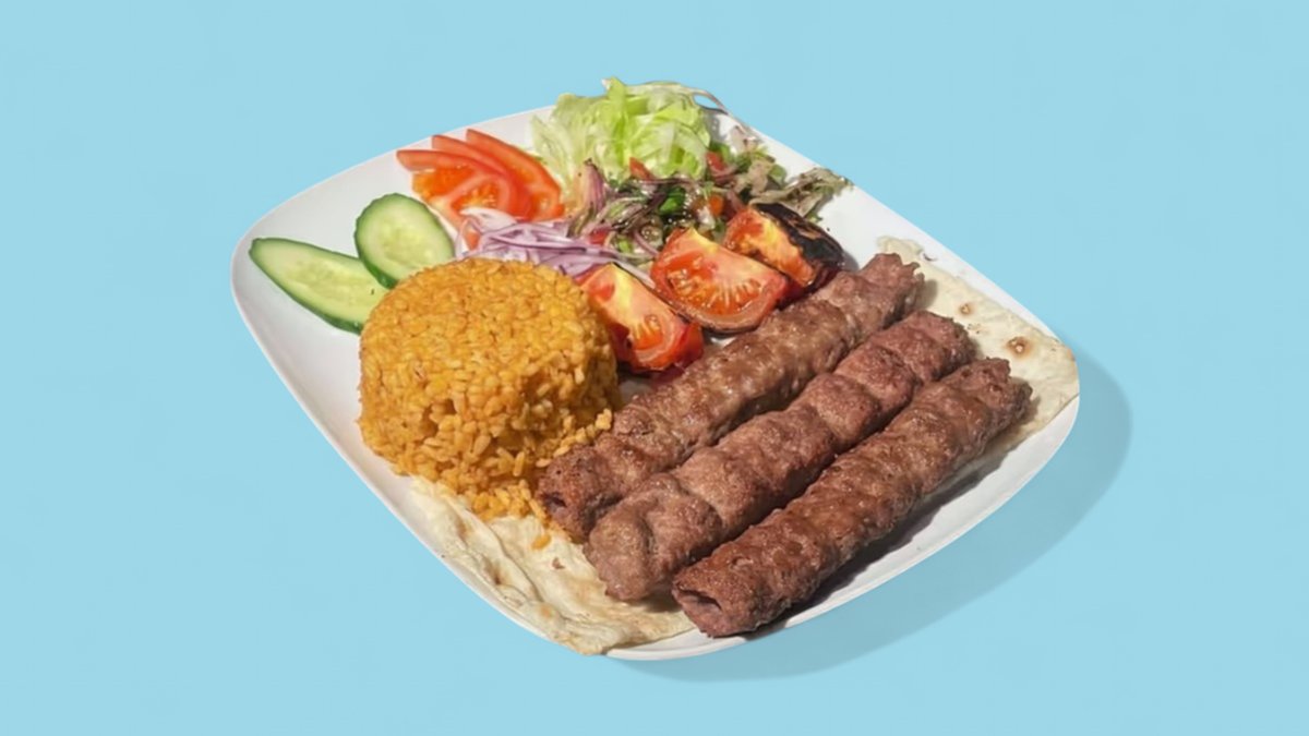Tre spyd med mørt kjøtt marinert i krydder, grillet på spyd og servert med nybakt brød, frisk salat, dressing. Inneholder: gluten og melk