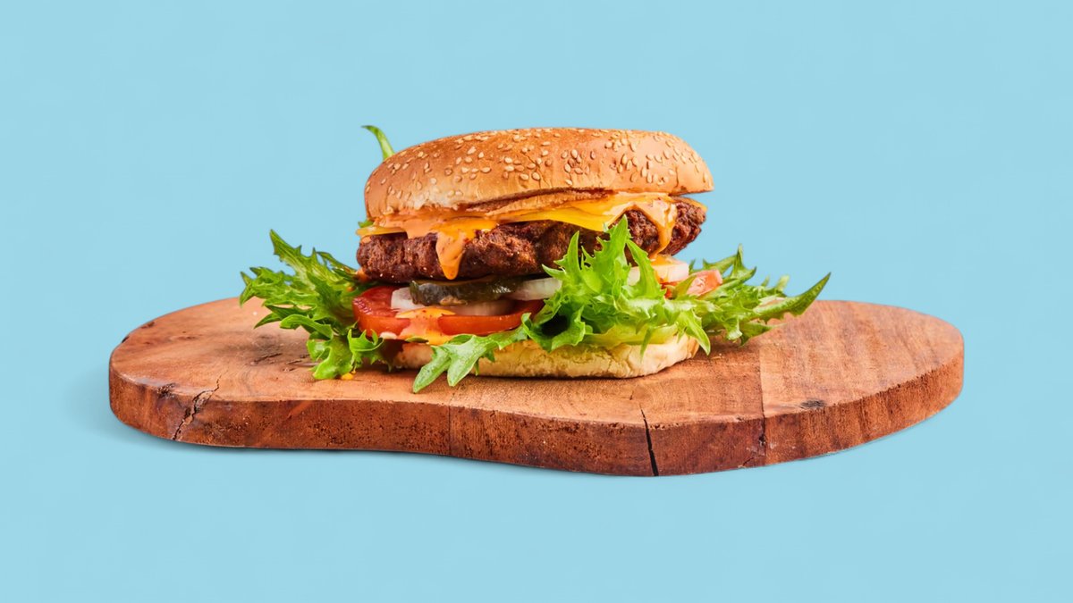 Saftig biffburger servert i mykt brød med frisk salat, tomat, løk og dressing.