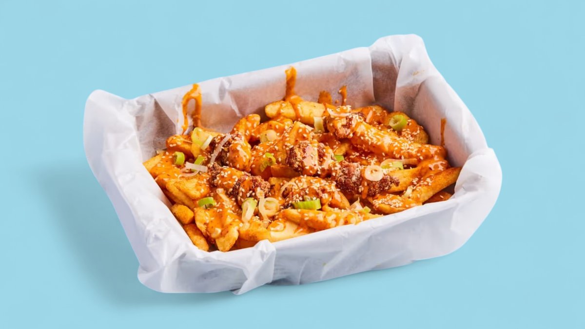 Loaded Umami steak fries og fritert kylling med chili-og honningdressing. Toppes med vårløk og sesamfrø. Kremete og krispy!
