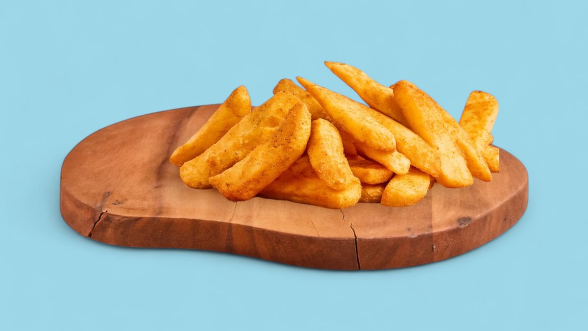 Tykke fries som er krispy på utsiden og fluffy på insiden. Serveres med fløyelsmyk majones med smak av soya og honning. Velg om du ønsker med eller uten dip.