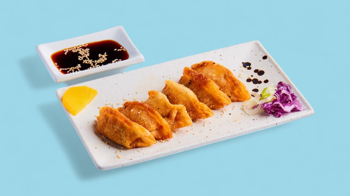 Hjemmelagde friterte koreanske dumplings med kimchi (fermentert sterk hodekål), silketofu, purre og løk. Velg mellom 5 eller 10 biter.
