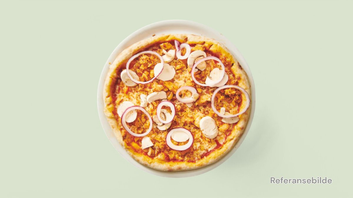 Stor pizza med champignon, tomater, løk, paprika, mais, jacobs osteblanding og oregano.