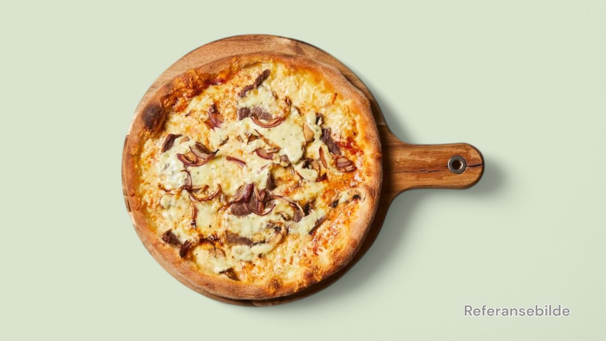 Stor pizza med marinert biffkjøtt, champignon, løk og ost.