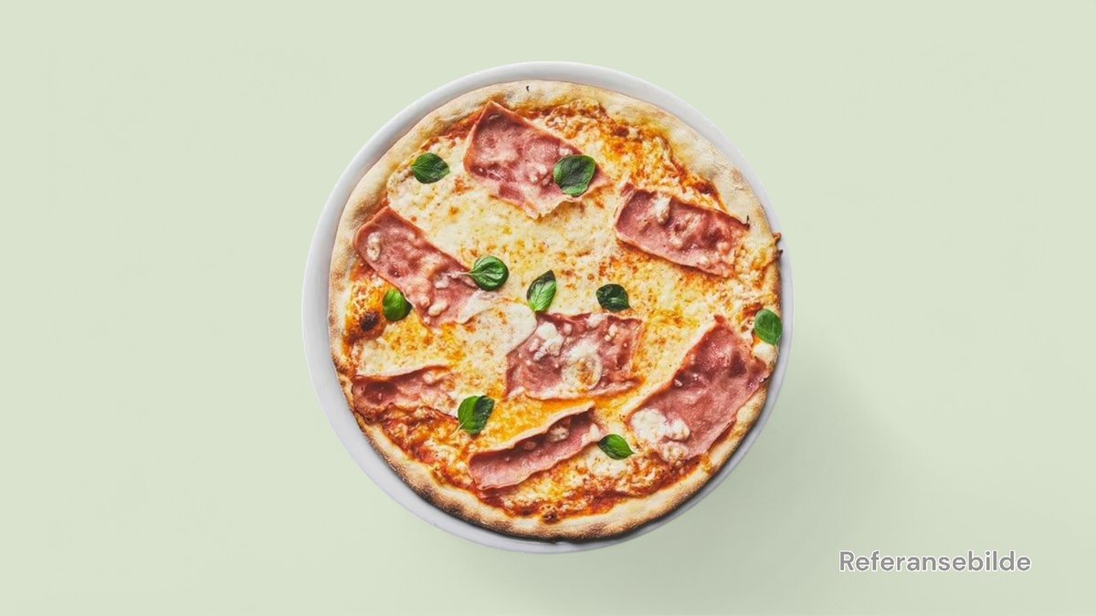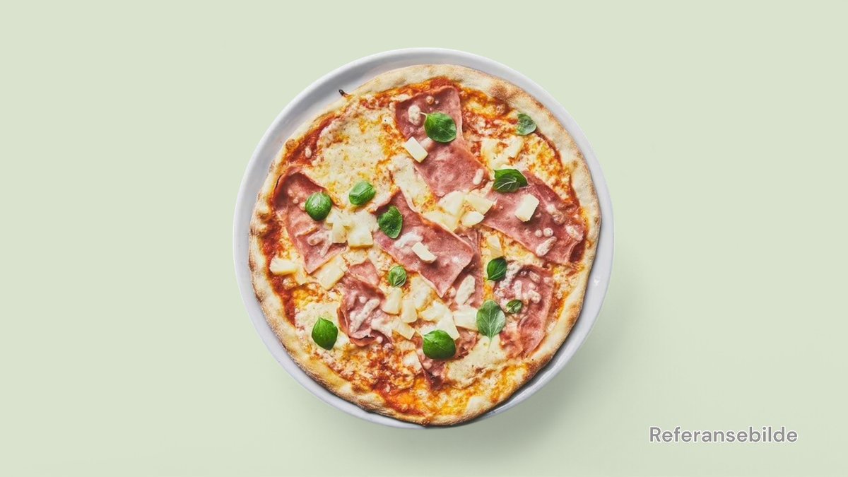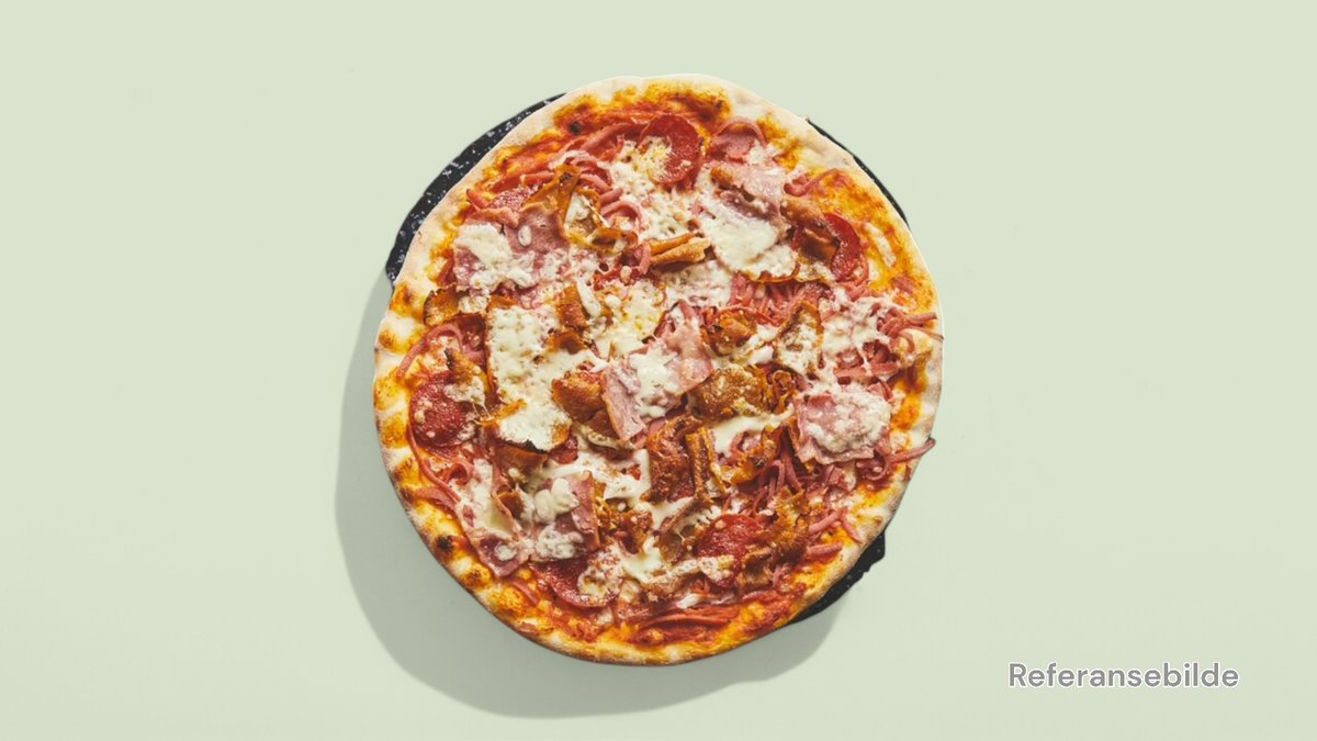 Stor pizza med skinke, kjøttdeig, løk og Jacobs osteblanding.
