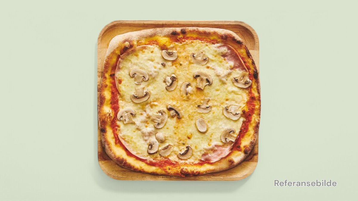Stor pizza med champignon, skinke, løk og Jacobs osteblanding.