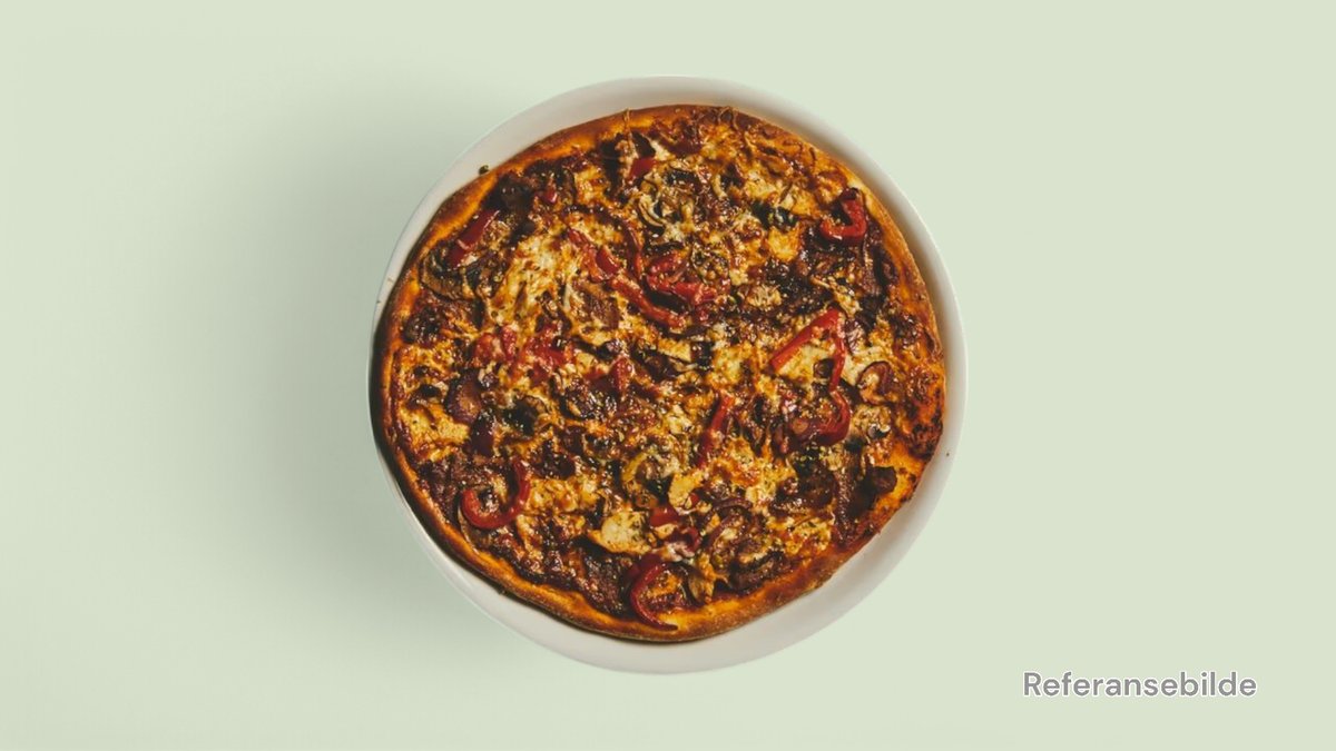 Stor pizza med champignon, løk, paprika, skinke, kjøttdeig, biff, pepperoni, tomatsaus, orientalsk krydderblanding og Jacobs