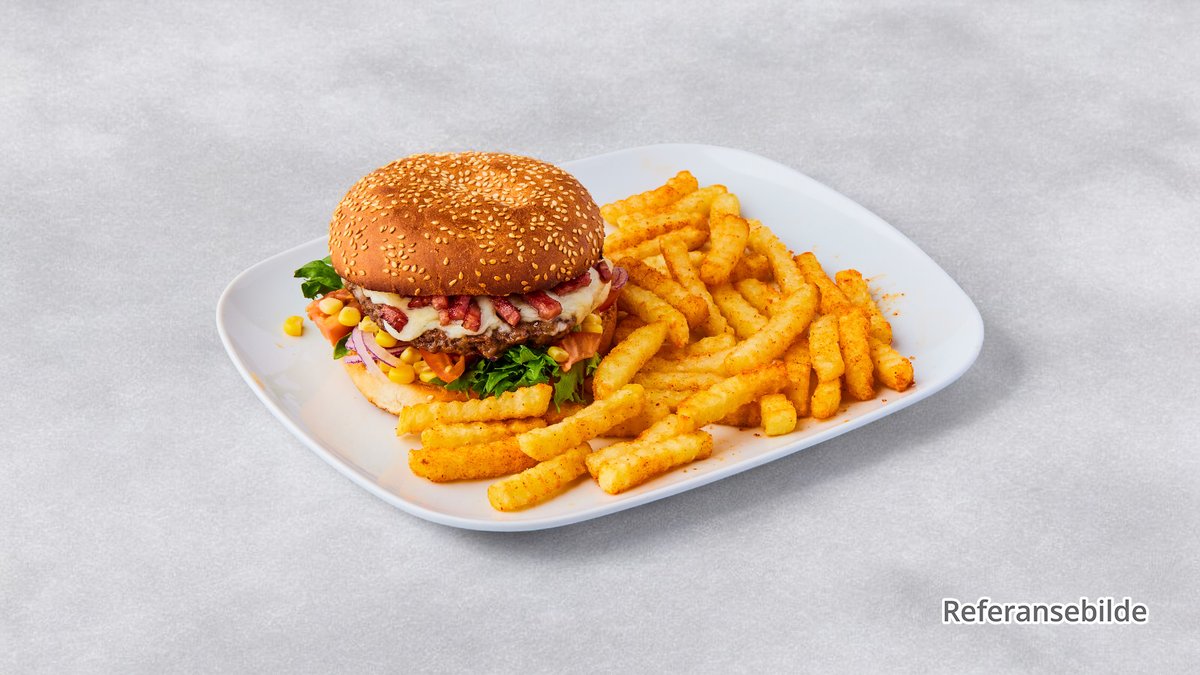 Biff kjøttdeig, bacon, pepperoni og løk.