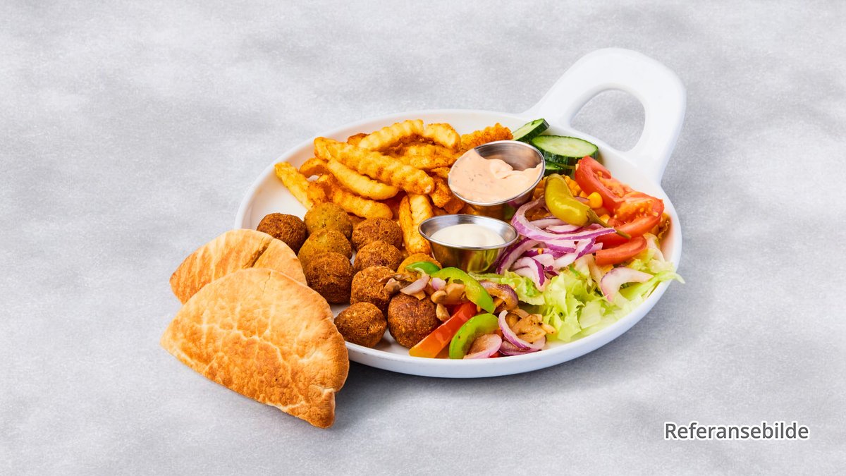 Strimlet indrefilet, kyllingfilet, chips, grønnsaker, peppersaus, hvitløkssaus og ris.