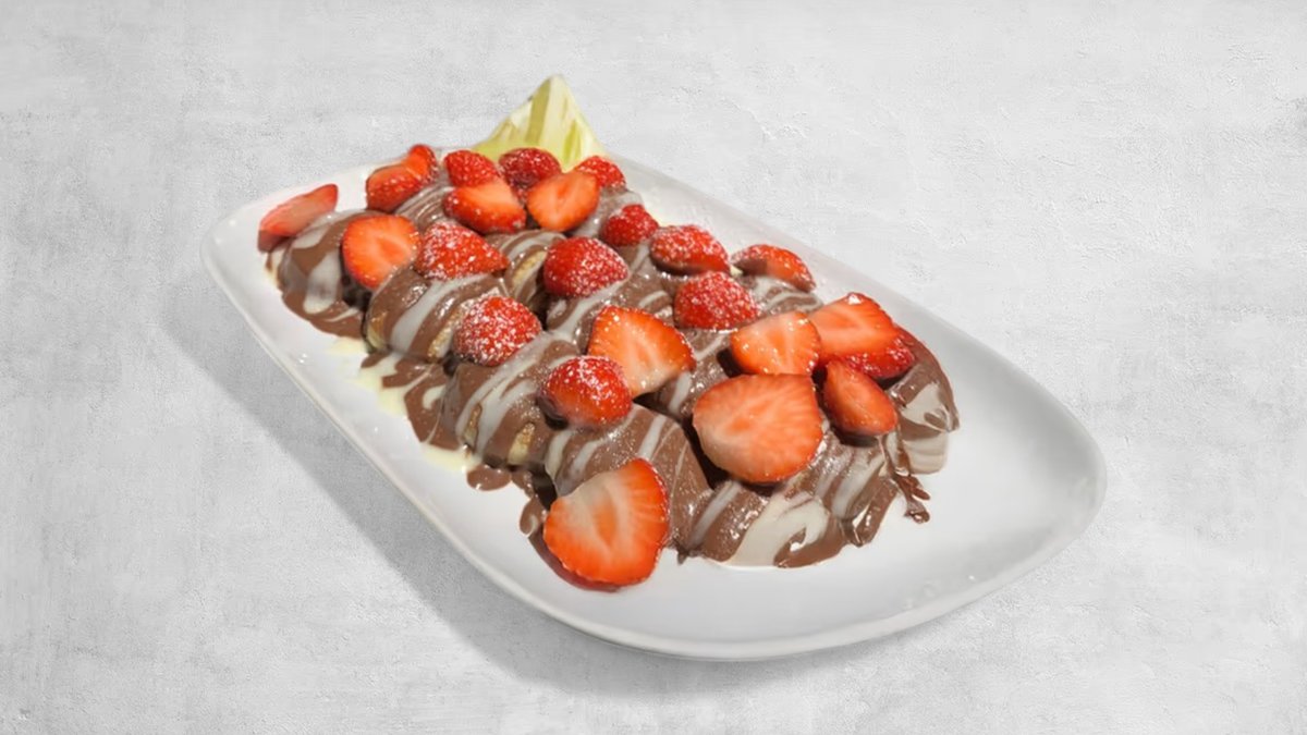 Mini pannekaker med fløyselsmyk nugatt, hvit sjokolade og sjokolade saus, toppet med ferske jordbær. Serveres med kuleis.