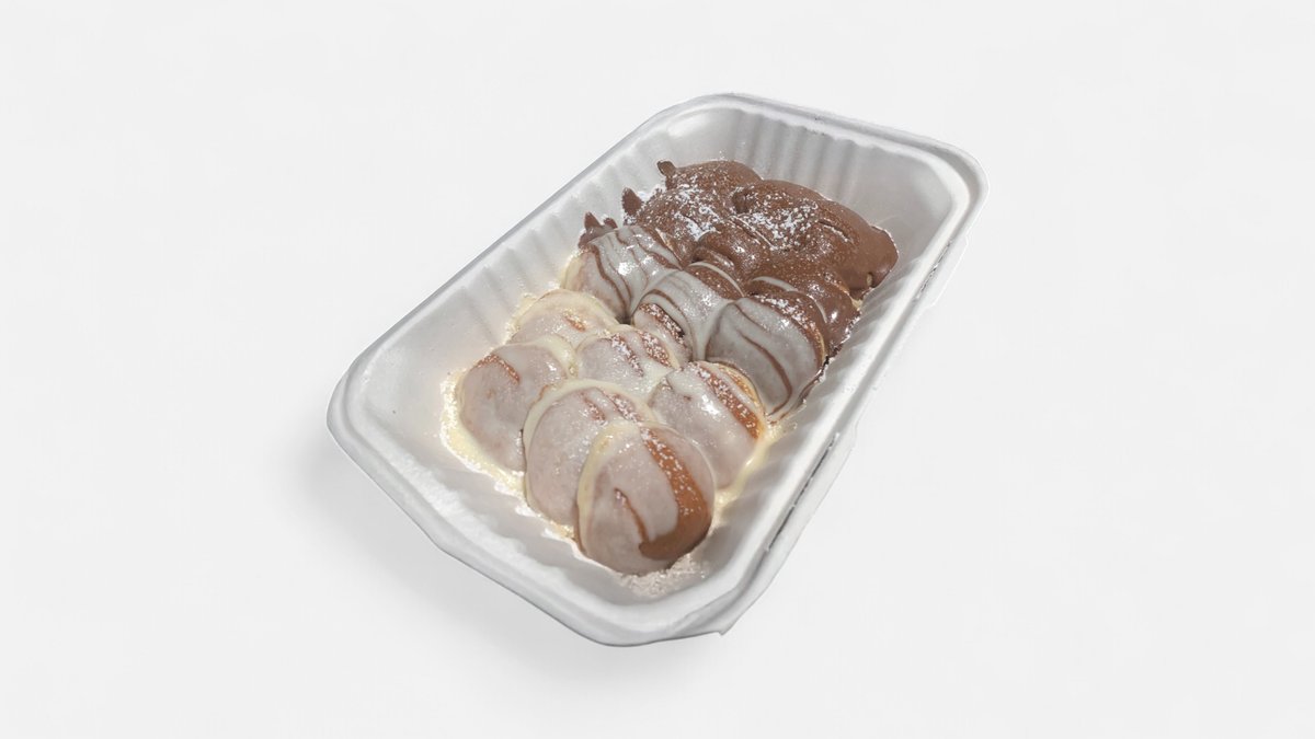 Mini-pancakes smøret med fløyselsmyk nugatt, halv hvit og halv sjokolade saus. Serveres med kuleis.