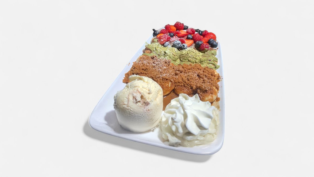 Varm vaffel smøret med fløyselsmyk nugatt, hvit sjokolade og toppet med ferske jordbær, blåbær, banan og bringebær. Følger med is-kule.