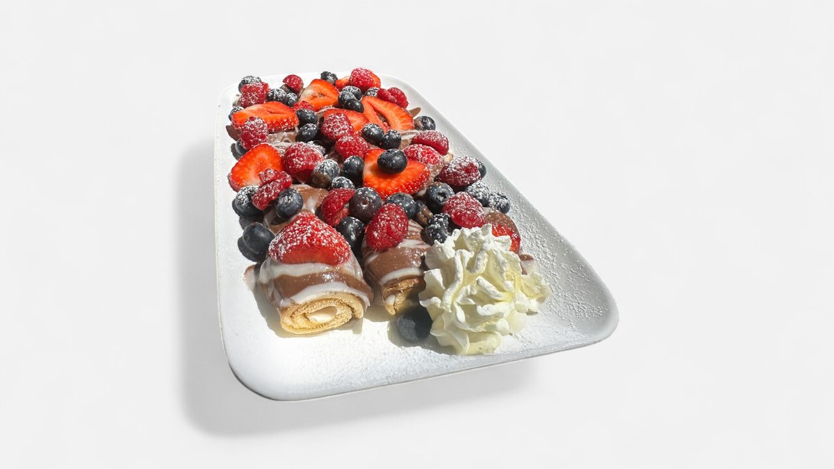 Mini pannekaker med fløyselsmyk nugatt, toppet med ferske bær (jordbær, bringebær, blåbær). Serveres med kuleis.