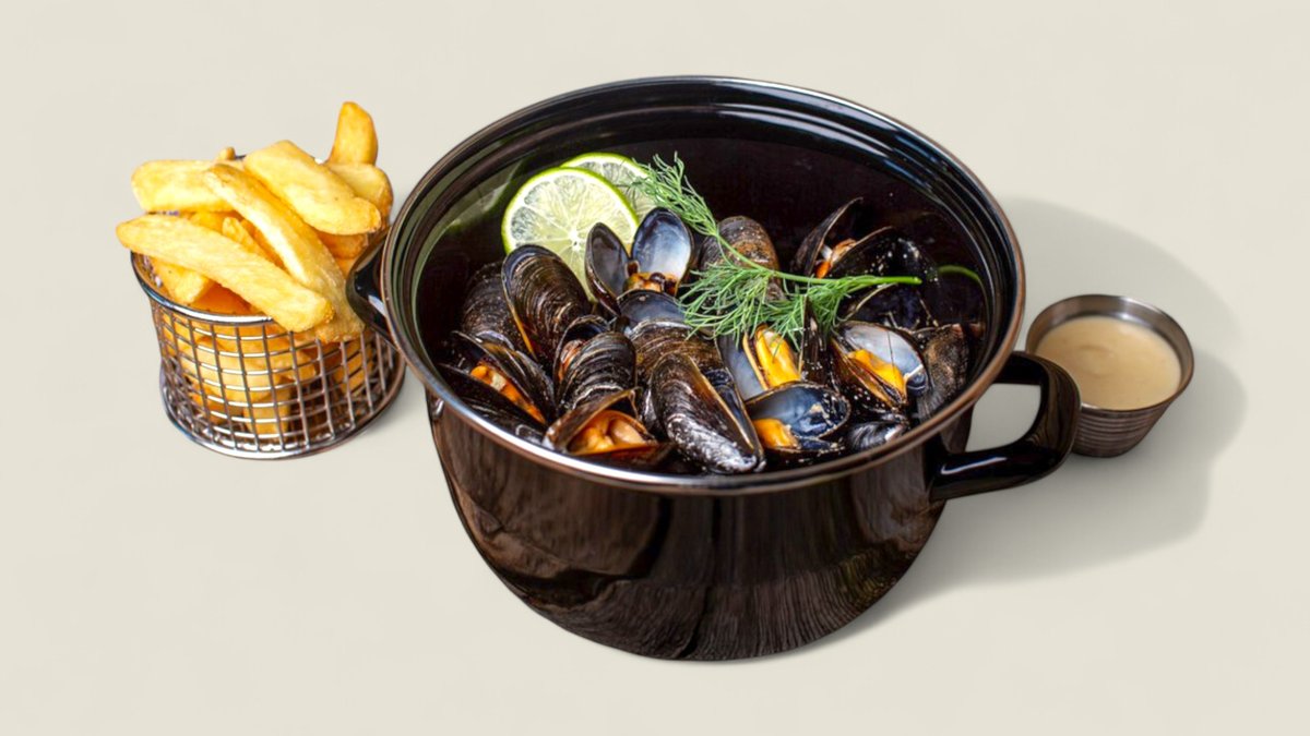 Ferske blåskjell dampet i curry- og kokossaus. Serveres med fries og aioli. Velg mellom liten eller stor porsjon.