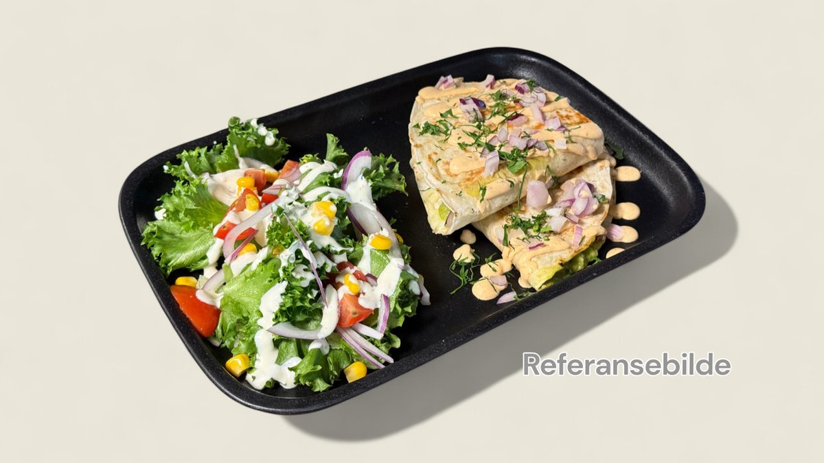Grillet tortilla fylt med smeltet mozzarella, guacamole, rødløk og koriander. Toppet med kremet chilidressing, rødløkog koriander. Serveres med salat.