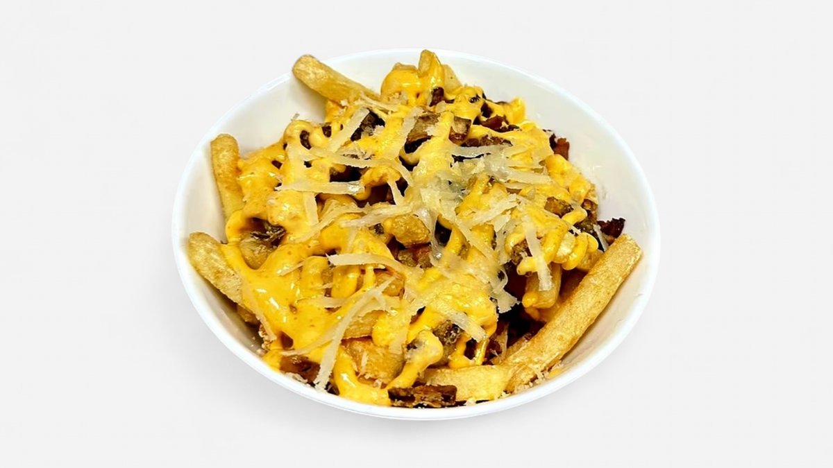 Pommes frites toppet med sprøstekt baconbiter, dirty fries dressing, parmesan og sprøstekt løk